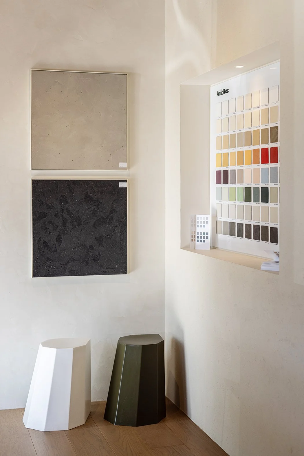 Divided into three distinct spaces, each combining textured ceilings or walls with joinery elements, the showroom showcases the breadth of application possibilities and the flexibility of our finishes. The plaster finishes are presented at scale, allowing clients to experience how light and texture interweave and how subtle shifts in tone influence the result.